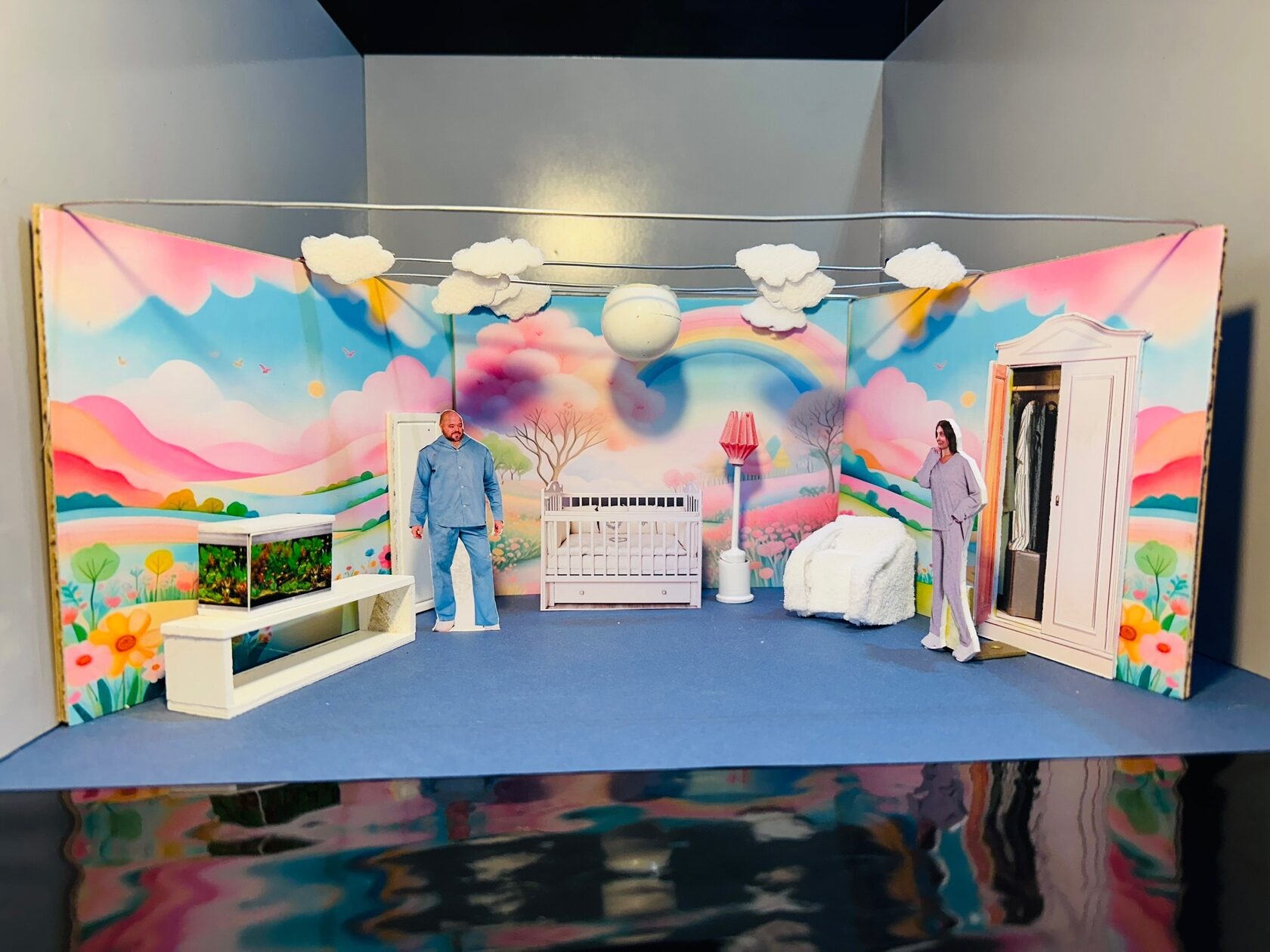 История про девочку Машу, которая очень не любила ложиться спать, будет поставлена как сказка, разыгранная родителями для ребенка. На эскизах и макете, подготовленных художником, легко угадываются мама и папа – Людмила и Егор Абаховы. А в животных, с которыми Маша встретится по ходу сказки, превратятся окружающие девочку вещи – например, прикроватный коврик или перчатка.