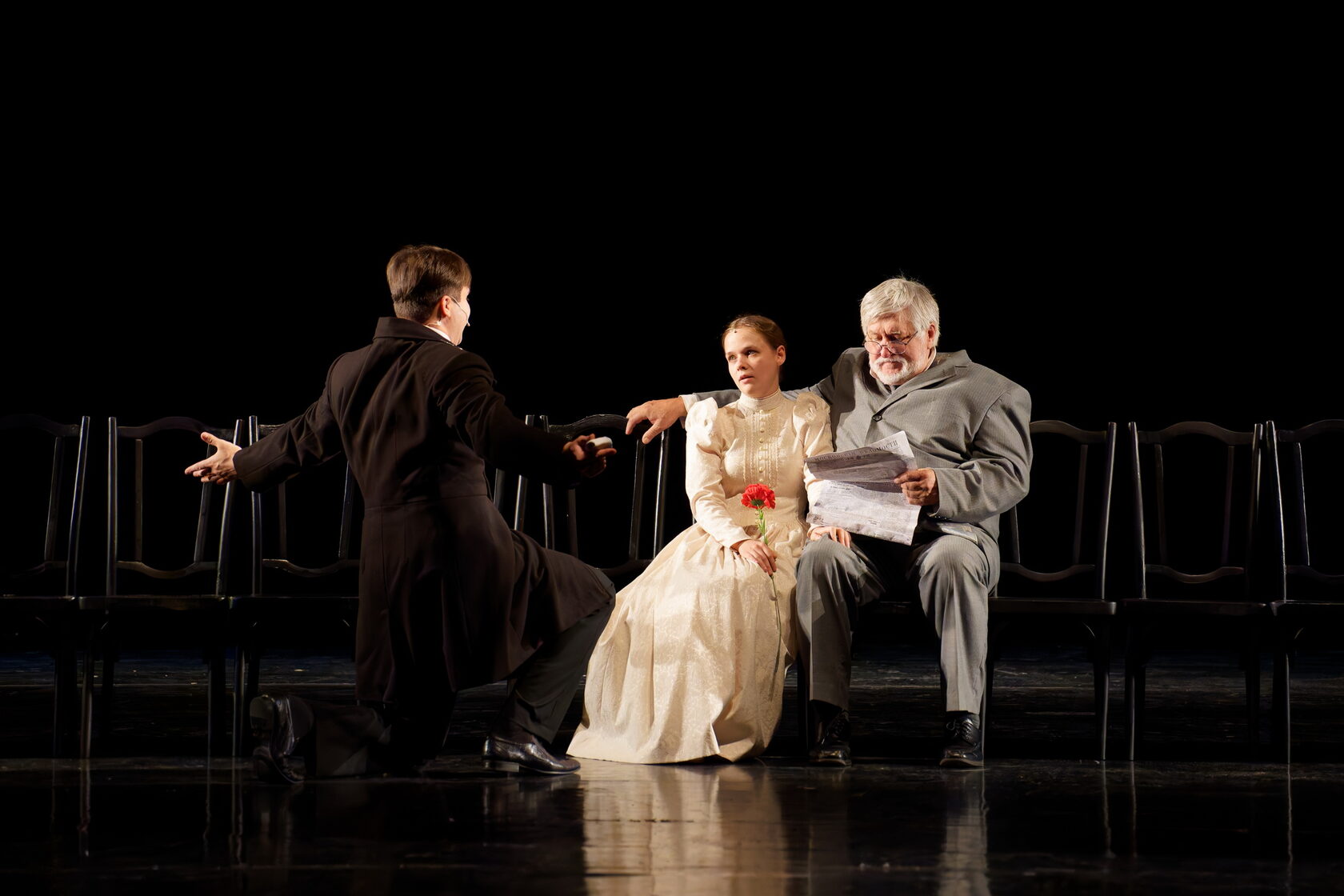 На аскетичном фоне артисты не играют, они живут в предлагаемых им трагичных обстоятельствах. Похоронив отца, три сестры и брат Прозоровы, получившие блестящее образование и воспитание — настоящие русские интеллигенты — вступают во взрослую жизнь, которая оборачивается к ним отнюдь не радужной своей стороной. Всё в их жизни складывается не так, как они запланировали — по известной поговорке «Человек предполагает, а Бог располагает». Так, старшая сестра Ольга (Ирина Аввакумова) хотела бы бросить работу учительницей в женской гимназии и выйти замуж, но вынуждена стать в этой гимназии начальницей. У вечно усталой уработавшейся женщины постоянно болит голова. Как же мне близок этот персонаж в исполнении Ирины Аввакумовой! Я смотрюсь в него как в зеркало: начальственная должность, которую вынуждена была занять, вечная усталость и головная боль — и отсутствие времени и сил, чтобы просто жить… Вторая сестра, Маша (Ольга Есина), неудачно вышла замуж и вынуждена терпеть нелюбимого Кулыгина (Дмитрий Зонов), кудахчущего возле неё как наседка. А любит она другого — офицера Вершинина (Максим Солнцев), женатого на безумной женщине (Вера Долженко), от которой скрывается в гостях у Прозоровых. Младшая сестра Ирина (Мария Раздобарина) мечтает о творческом созидательном труде, а вместо этого прозябает клерком на телеграфе, где всё выводит её из себя. И даже выйти замуж за Тузенбаха (Даниил Комаров), чьи взгляды созвучны ей, девушке не суждено… Брат Ольги, Маши и Ирины Андрей (Руслан Шегуров) в конце первого акта делает необдуманное предложение кокетливой Наташе (Екатерина Главатских), и тяжёлые последствия этого брака приходится пожинать всему семейству…